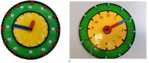 2 horloges en relief, les aiguilles sont mobiles pour pouvoir indiquer n’importe quelle heure.